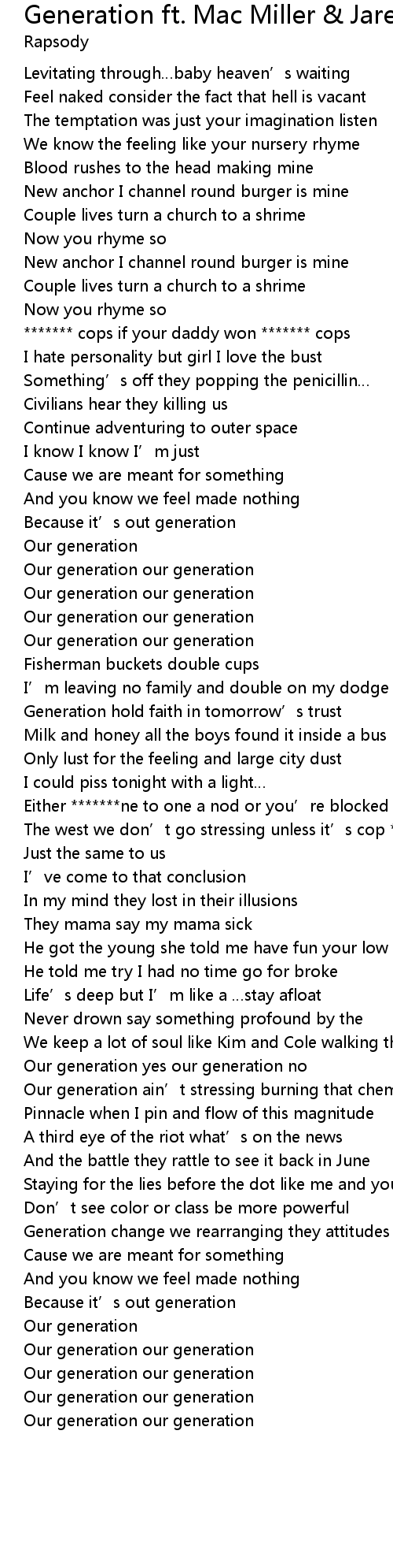 | Song | Generation ft. Mac Miller & Jared Evan (Prod. by 9th Wonder) |