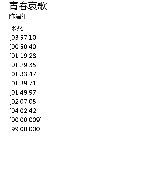 | [04:13.82][03:57.10][02:58.22][02:01.68][01:01.90][00:44.95] | 乡愁 |