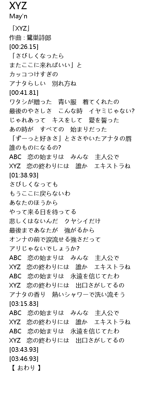 | [02:53.13] | XYZ 恋の終わりには 出口さがしてるの |