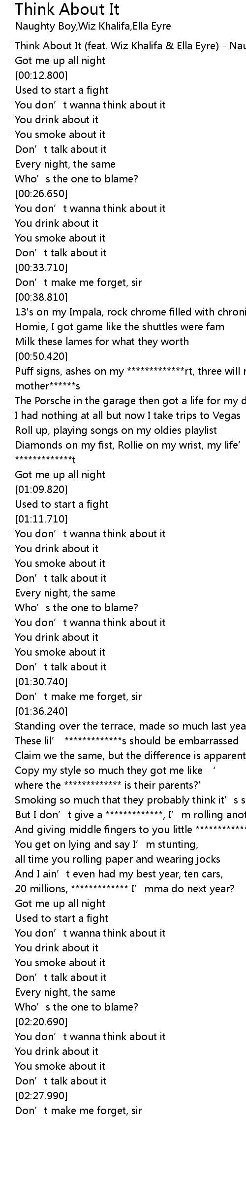 | [0-1:59.320] | Think About It (feat. Wiz Khalifa & Ella Eyre) - Naughty Boy |