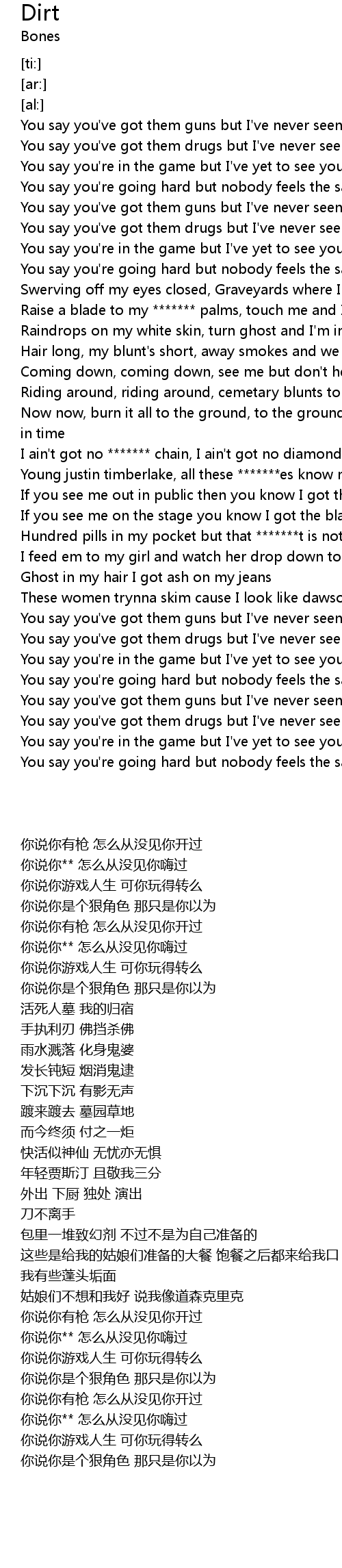 | [01:23.92] | Hundred pills in my pocket but that *******t is not for me |