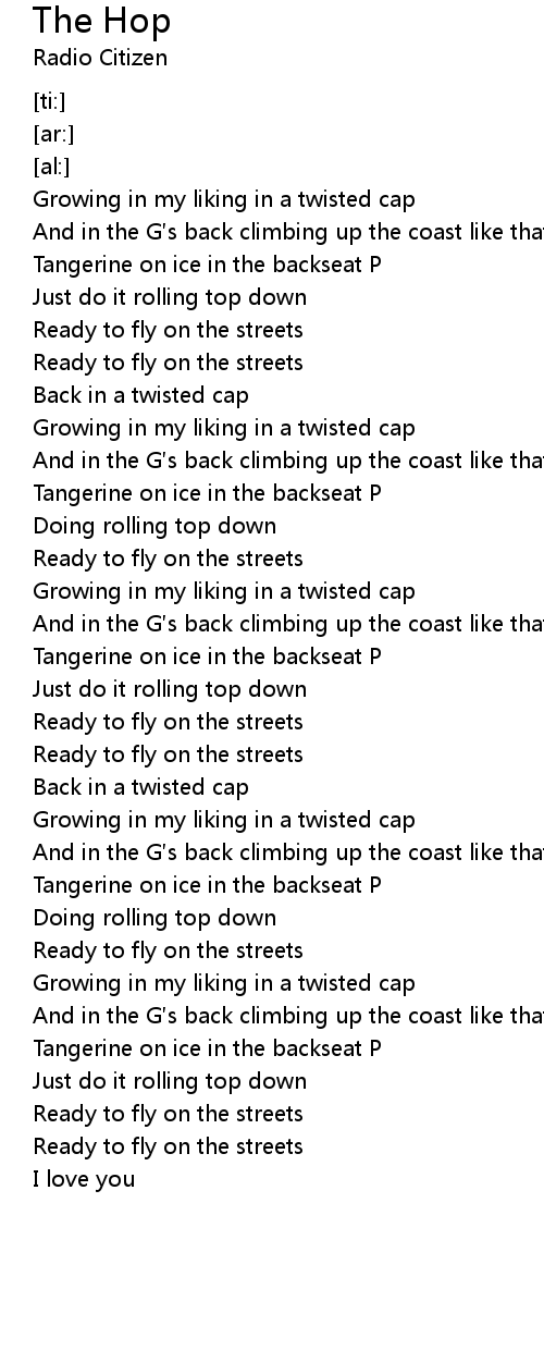 | [01:00.11] | Tangerine on ice in the backseat P |
