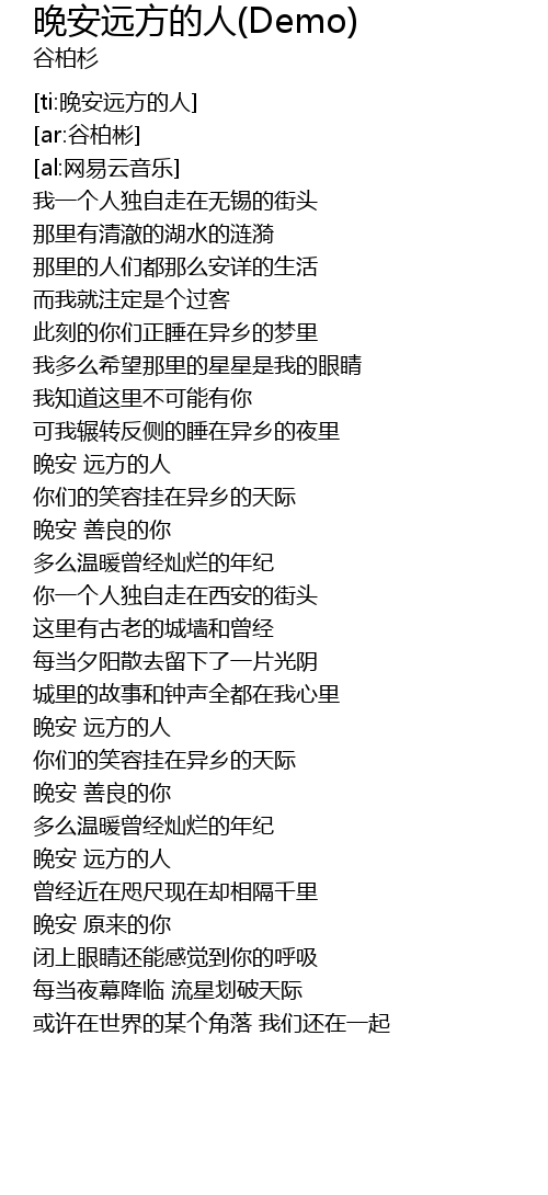 | [03:36.20] | wǎn ān yuǎn fāng de rén |