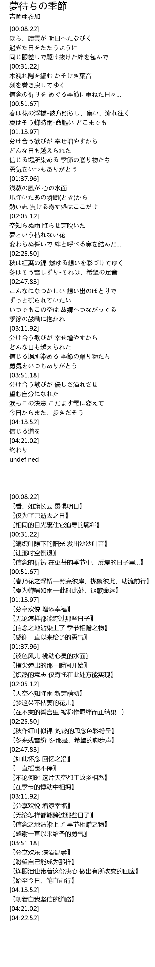 | [00:42.65] | 信念の祈りを めぐる季節に重ねた日々… |