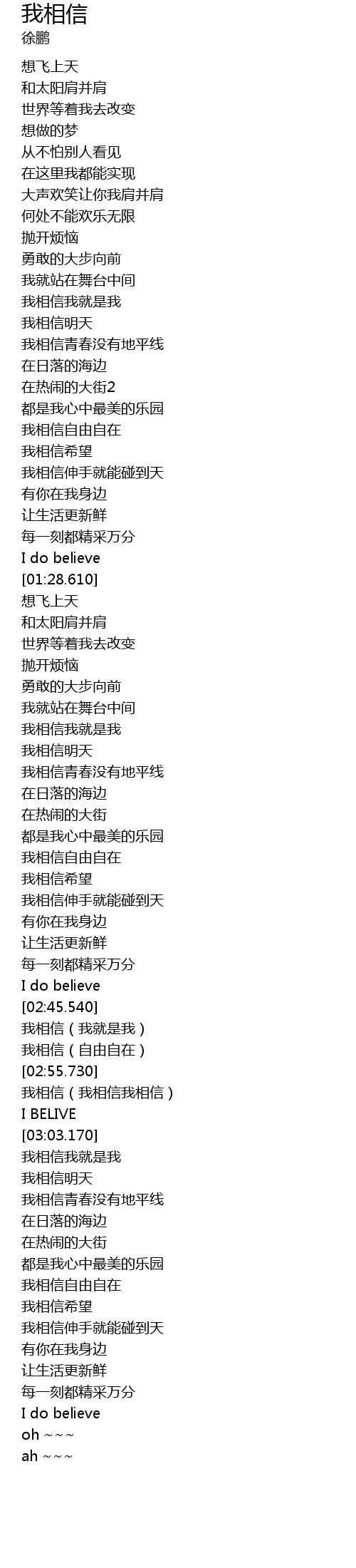 | [02:56.370] | wǒ xiāng xìn wǒ xiāng xìn wǒ xiāng xìn |