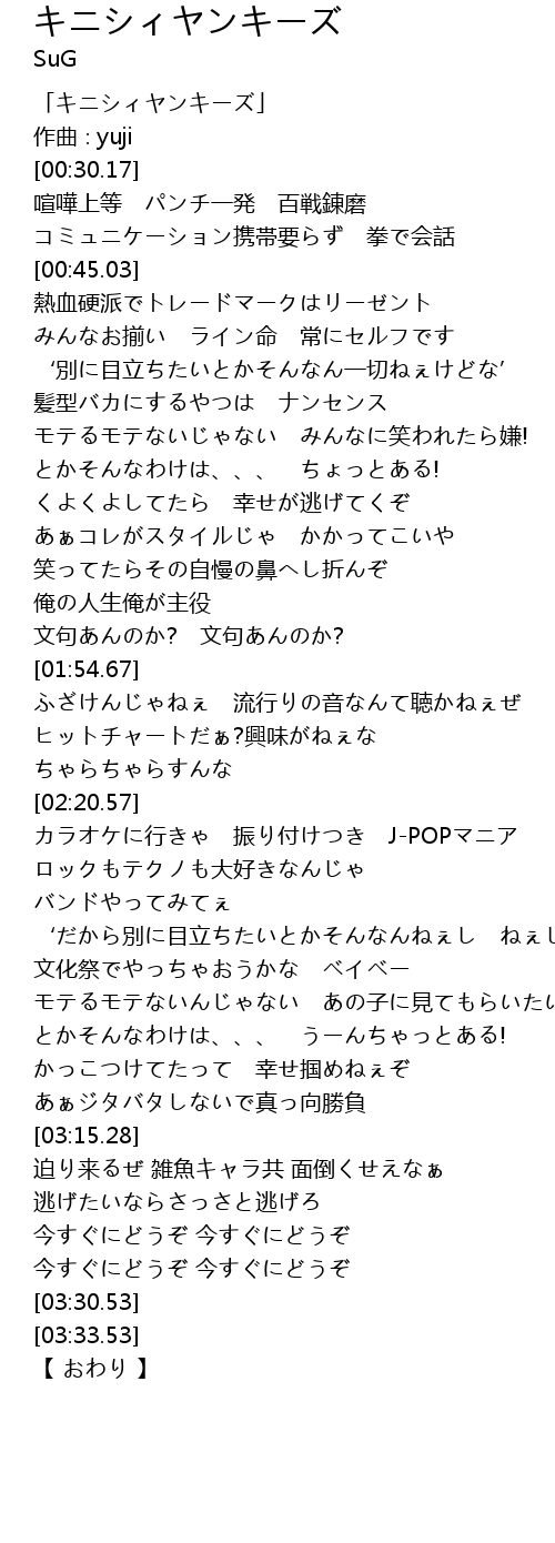 | [00:01.17] | 「キニシィヤンキーズ」 |