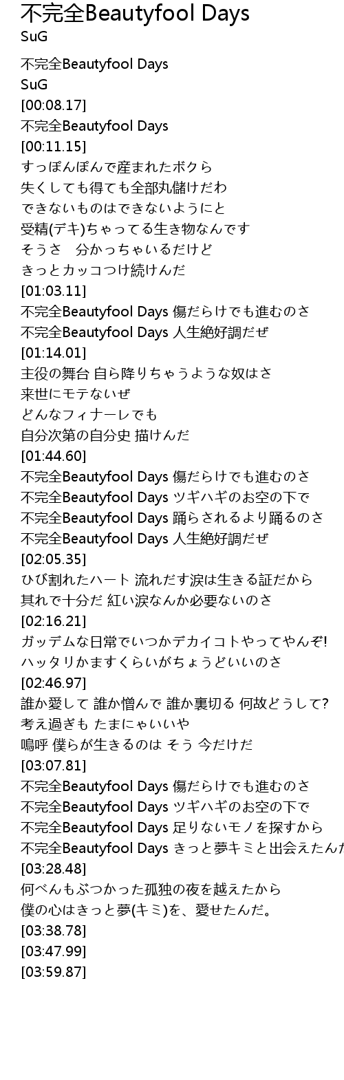 | [02:00.04] | 不完全Beautyfool Days 人生絶好調だぜ |