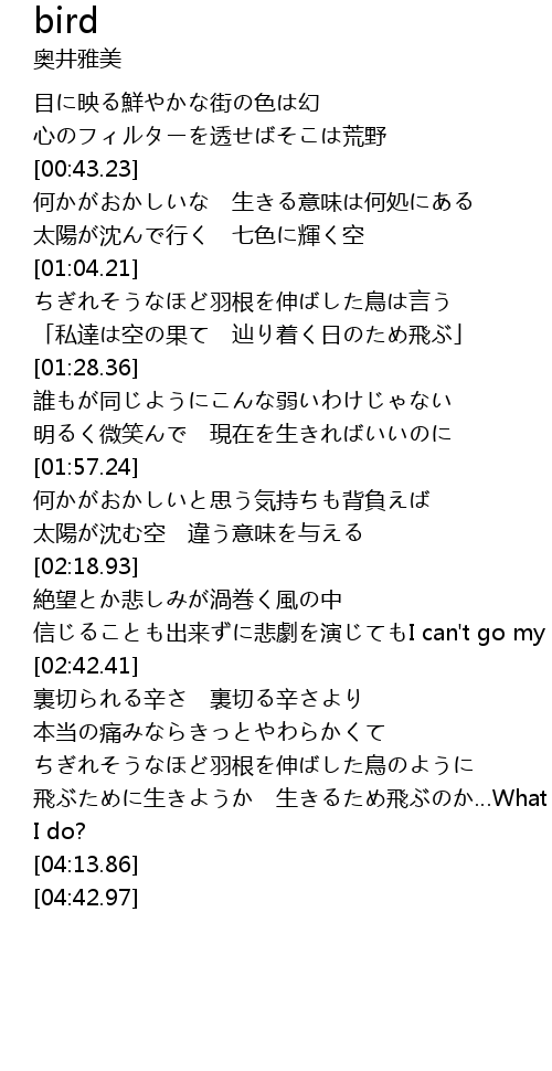 | [03:53.36] | ちぎれそうなほど羽根を伸ばした鳥のように |