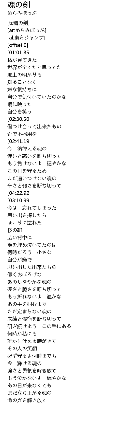 | [01:42.33][03:10.99][04:26.61] | 魂の剣を |