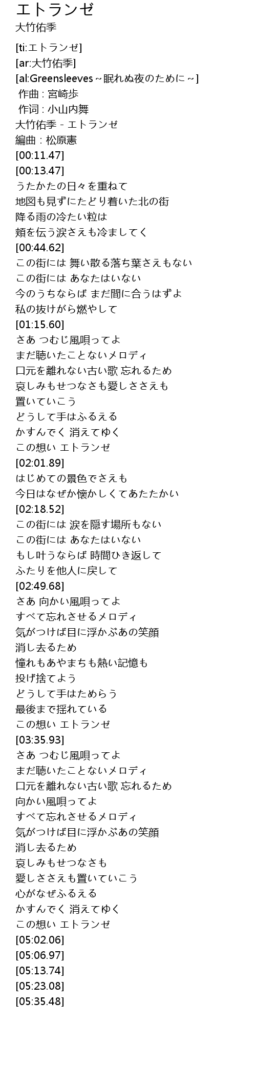 | [00:00.00] | 大竹佑季 - エトランゼ |