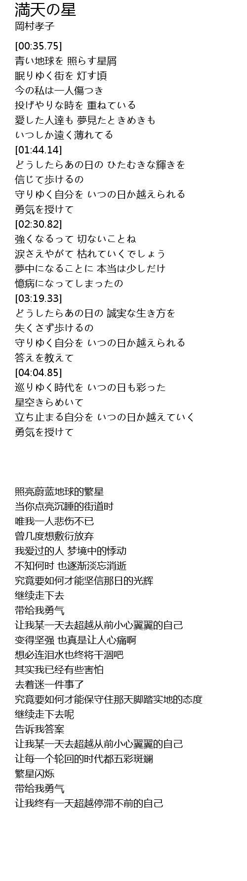 | [00:40.75] | 青い地球を 照らす星屑 |