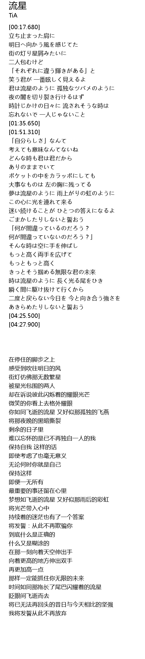 | [00:57.720] | 君は流星のように 孤独なツバメのように |