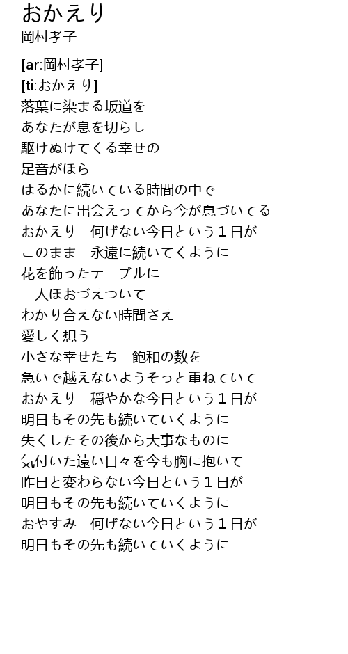 | [02:26.30] | おかえり 穏やかな今日という1日が |