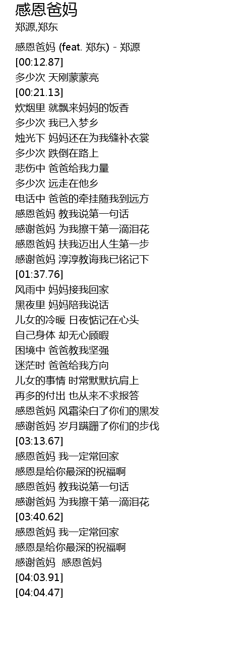 | [00:02.26] | 感恩爸妈 (feat. 郑东) - 郑源 |