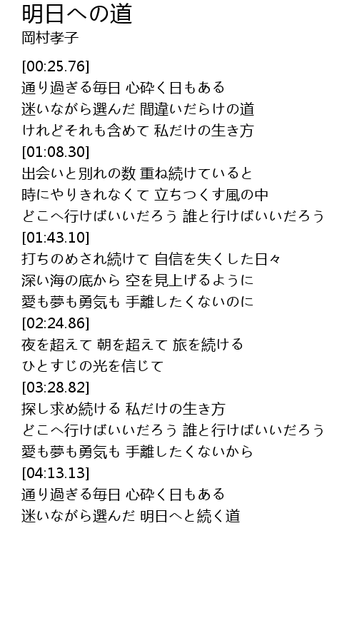 | [04:27.54] | 迷いながら選んだ 明日へと続く道 |