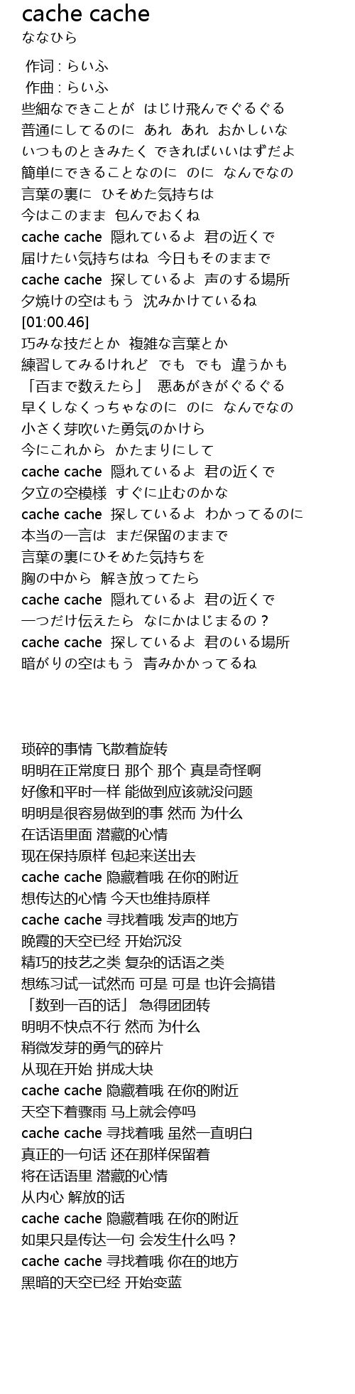 | [00:48.64] | cache cache 探しているよ 声のする場所 |