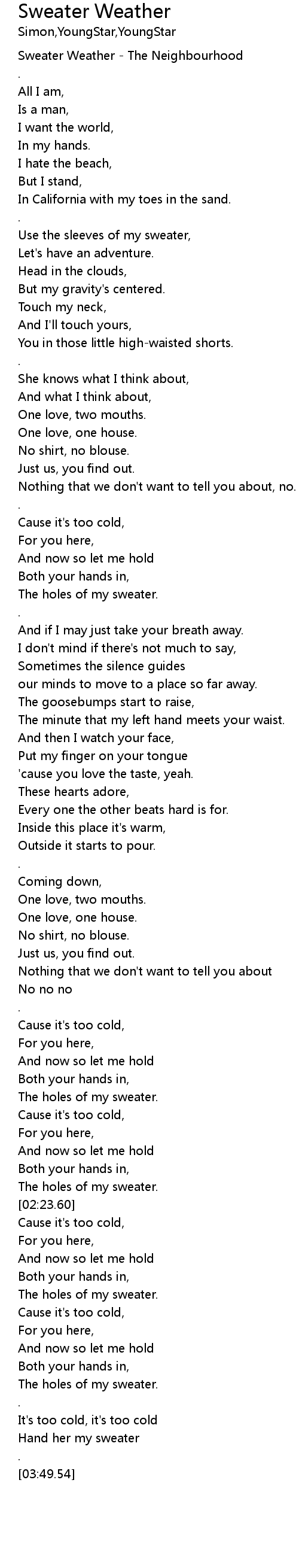 | [00:00.25] | Sweater Weather - The Neighbourhood |