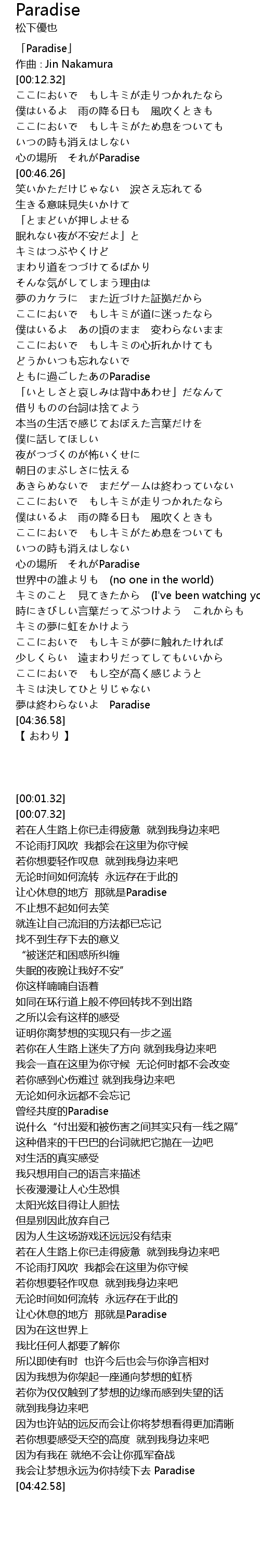 | [00:01.32] | 「Paradise」 |