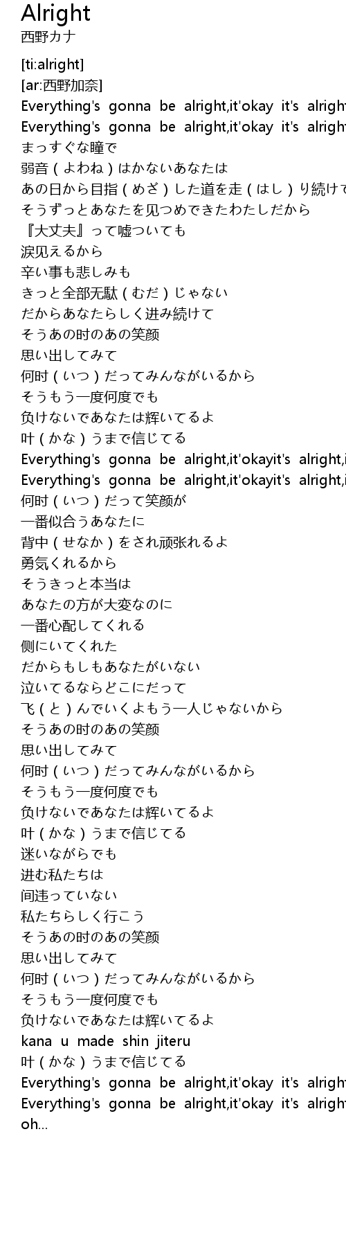 | [01:44.61] | Everything's gonna be alright,it'okayit's alright,it's okay |