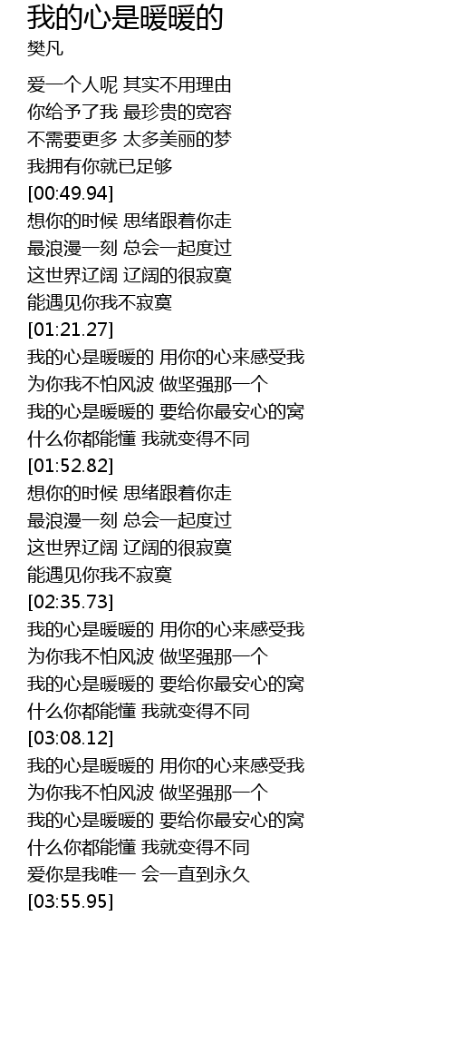 | [01:38.19] | 我的心是暖暖的 要给你最安心的窝 |