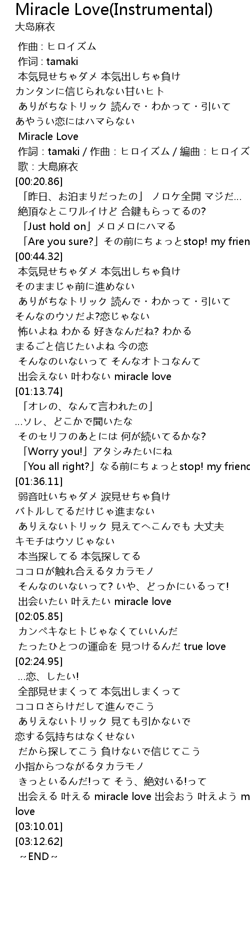 | [03:01.92] | 出会える 叶える miracle love 出会おう 叶えよう miracle love |