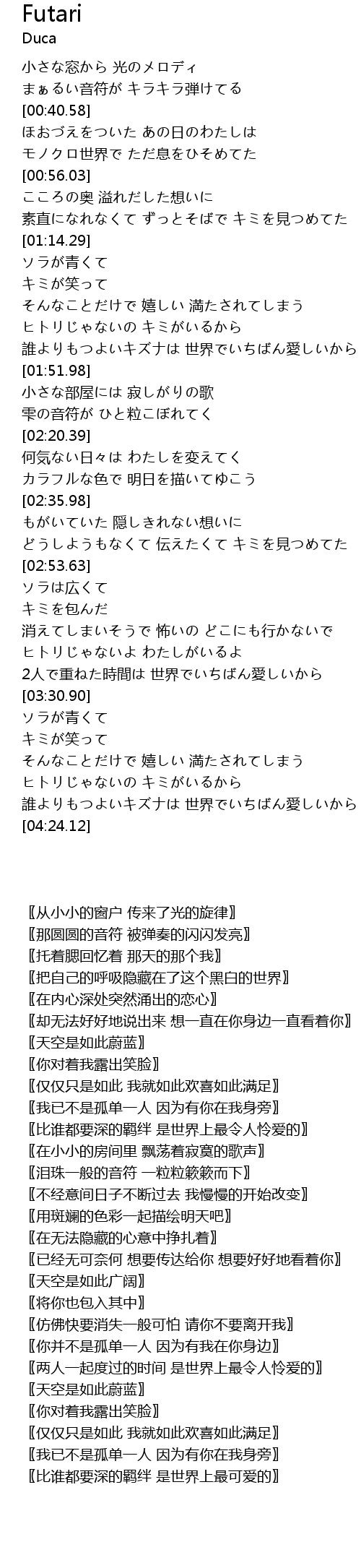 | [01:38.86] | 誰よりもつよいキズナは 世界でいちばん愛しいから |