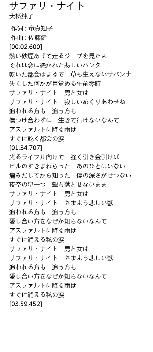 | [00:59.076] | サファリ・ナイト 寂しいめぐりあわせね |
