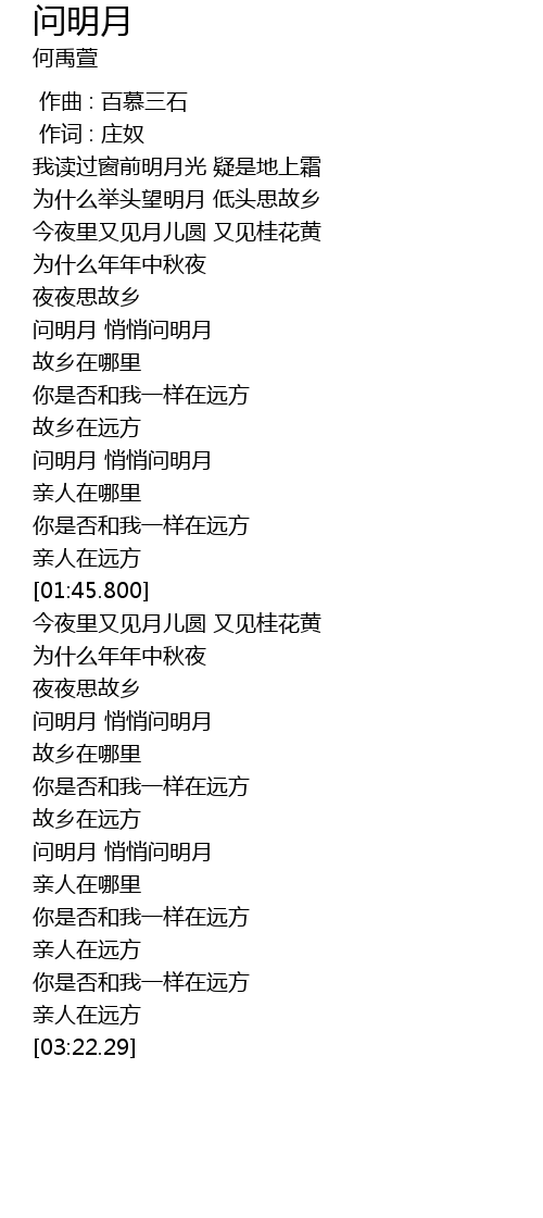 | [02:53.850] | wèn míng yuè qiāo qiāo wèn míng yuè |