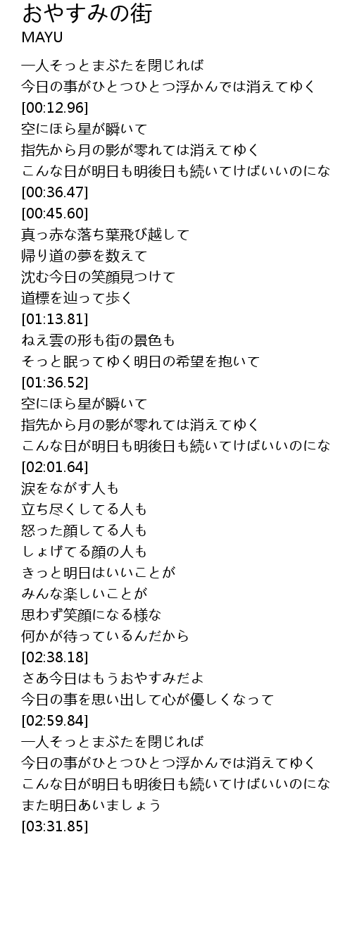 | [03:12.82] | こんな日が明日も明後日も続いてけばいいのにな |