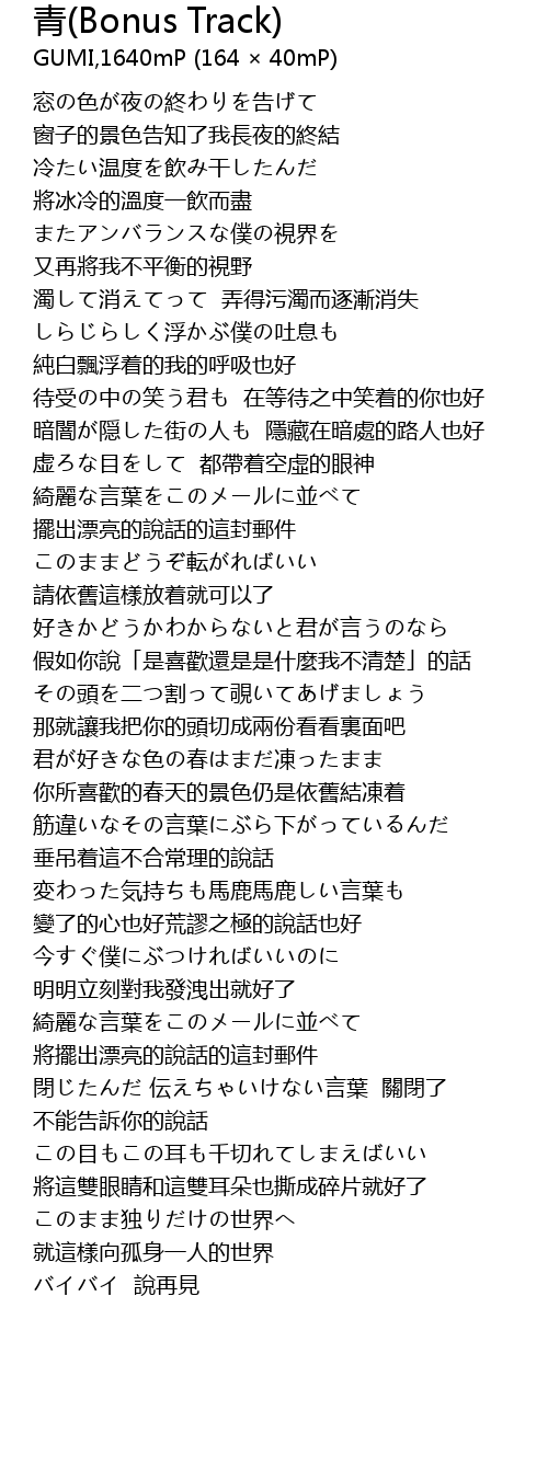 | [03:00.96] | 綺麗な言葉をこのメールに並べて 將擺出漂亮的說話的這封郵件 |