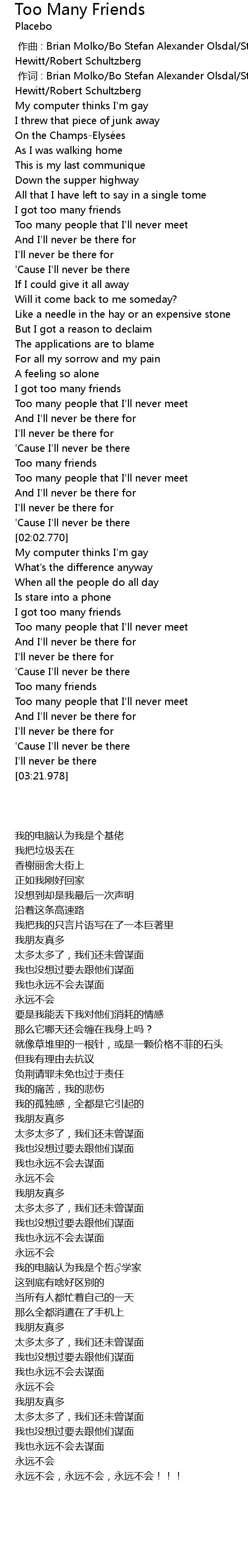 | [00:00.463] | 作词 : Brian Molko/Bo Stefan Alexander Olsdal/Steve Forrest/Steve Hewitt/Robert Schultzberg |