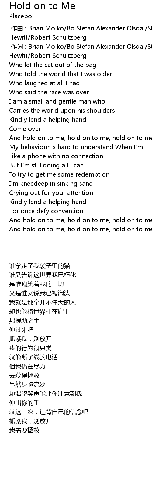 | [01:54.31] | And hold on to me, hold on to me, hold on to me, Hold ooonn |