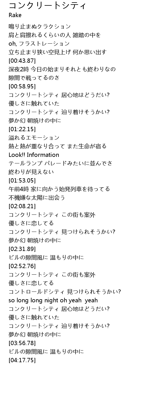 | [00:59.68] | コンクリートシティ 居心地はどうだい? |