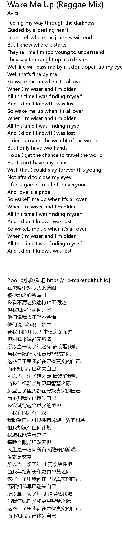 | [01:04.046] | So wake me up when it's all over |