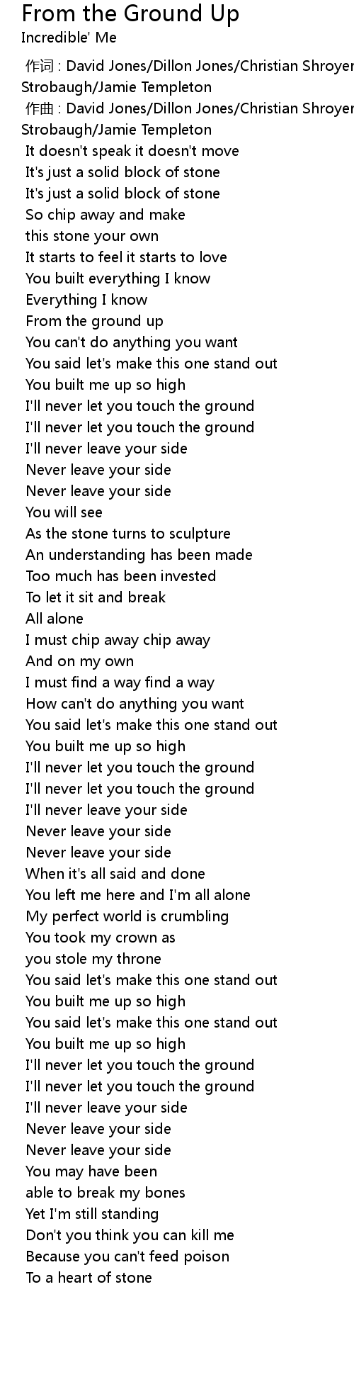 | [00:01.000] | zuo qu : David Jones Dillon Jones Christian Shroyer Lexie Olsen Alex Strobaugh Jamie Templeton |