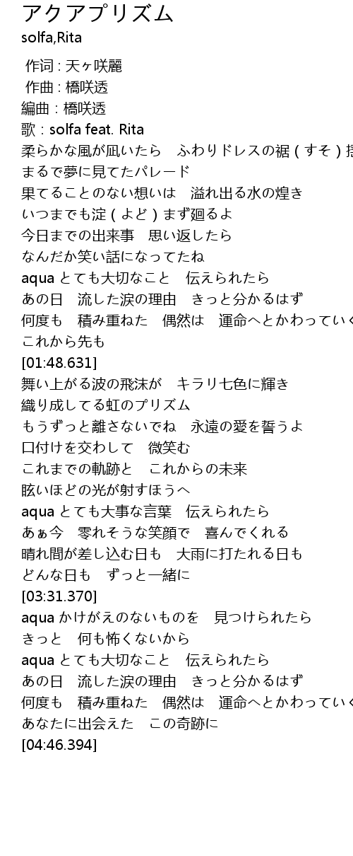 | [03:46.704] | aqua かけがえのないものを 見つけられたら |