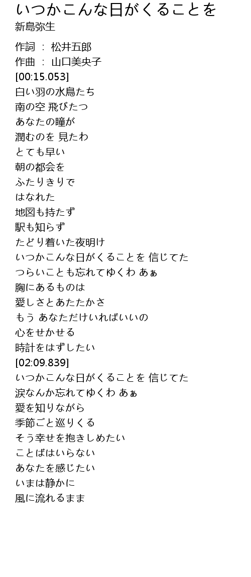| [02:32.183] | いつかこんな日がくることを 信じてた |