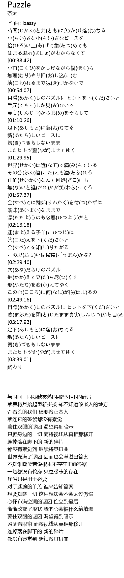 | [03:18.03] | 足下(あしもと)に落(お)ちてる 新(あたら)しいピースに |