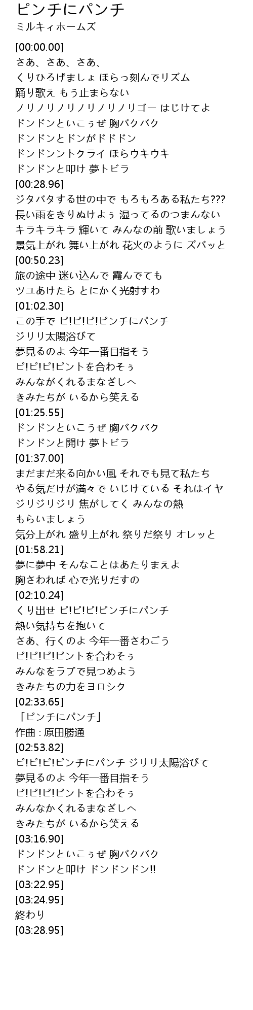 | [02:10.85] | くり出せ ピ!ピ!ピ!ピンチにパンチ 熱い気持ちを抱いて |