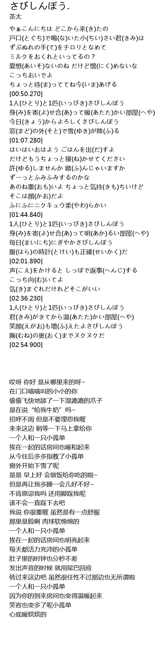 | [00:51.560] | 1人(ひとり)と1匹(いっびき)さびしんぼう |