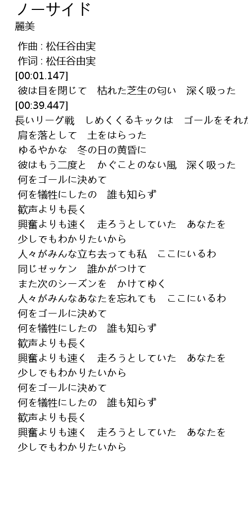 | [00:39.447] | 長いリーグ戦 しめくくるキックは ゴールをそれた |