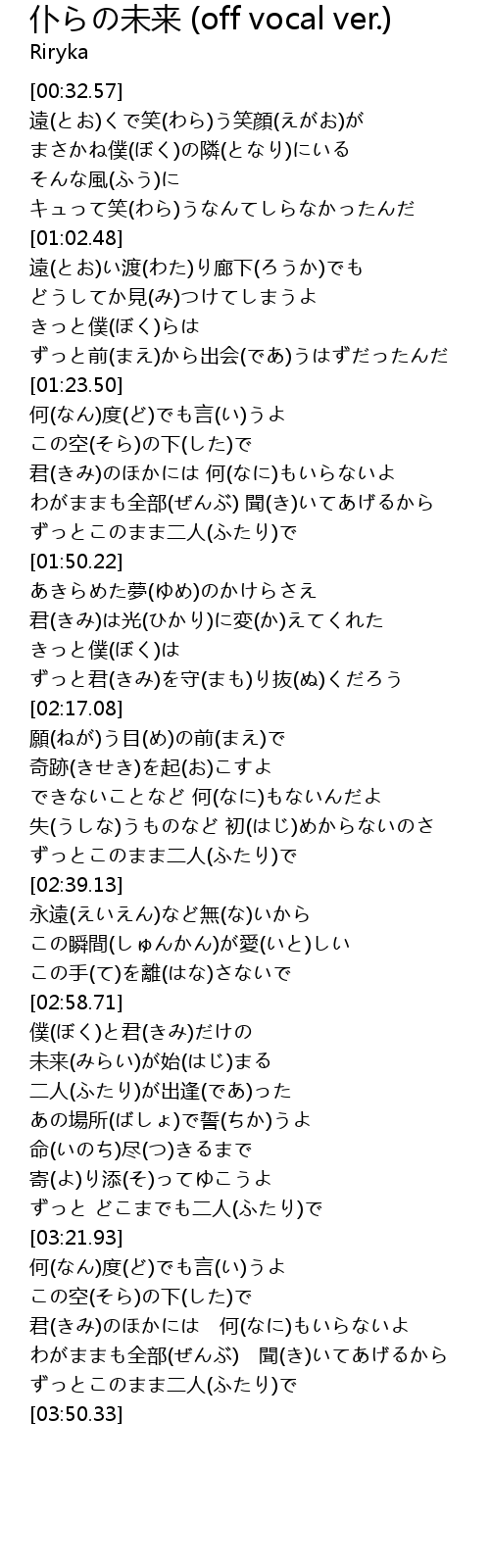 | [03:00.77] | 僕(ぼく)と君(きみ)だけの 未来(みらい)が始(はじ)まる |