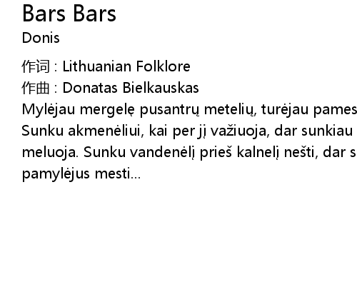 | Myl jau mergel pusantr meteli, tur jau pamesti d l moni kalbeli. Sunku akmen liui, kai per j va iuoja, dar sunkiau mergelei, kai mon s meluoja. Sunku vanden l prie kalnel ne ti, dar sunkiau mergel pamyl jus mesti... |