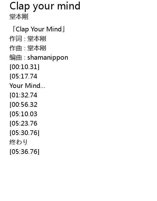 | [05:26.72][05:17.74][05:08.75][04:59.67][01:41.83][01:41.84][01:14.62][00:52.00][00:47.45][00:20.31] | Clap Your Mind |