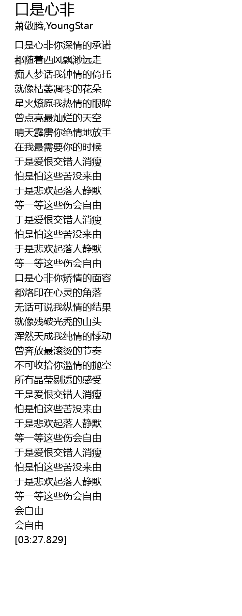 | [00:15.189] | kǒu shì xīn fēi nǐ shēn qíng de chéng nuò |