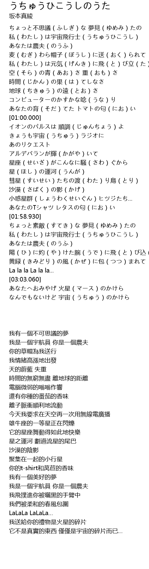 | [01:11.950] | きょうも宇宙(うちゅう)ラジオに あのリクエスト |