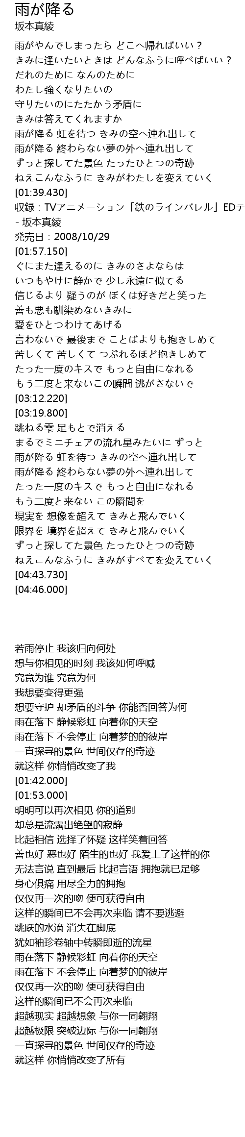 | [01:42.000] | 収録:TVアニメーション「鉄のラインバレル」EDテーマ:雨が降る - 坂本真綾 |