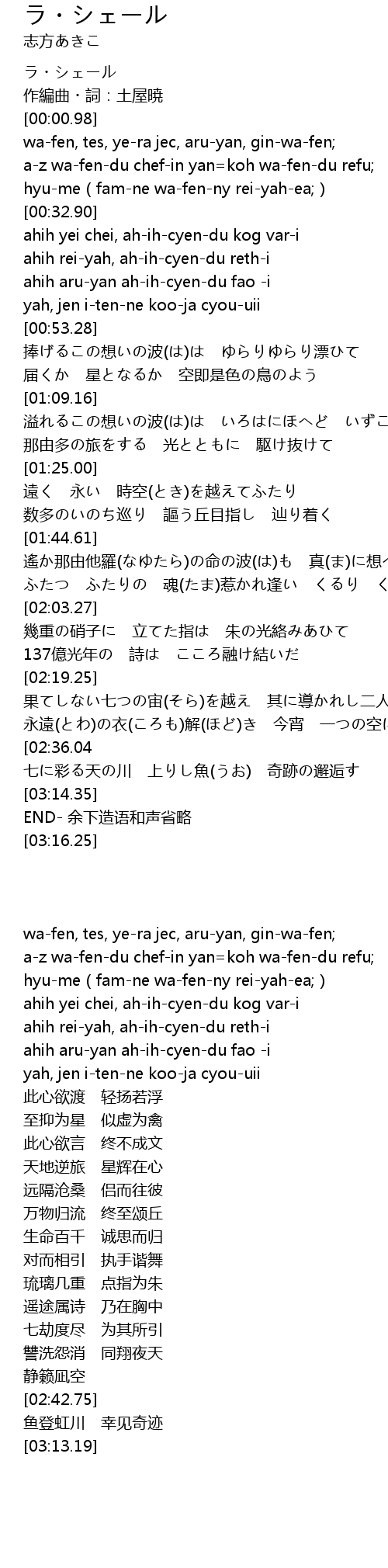 | [02:52.51] | 七に彩る天の川 上りし魚(うお) 奇跡の邂逅す |
