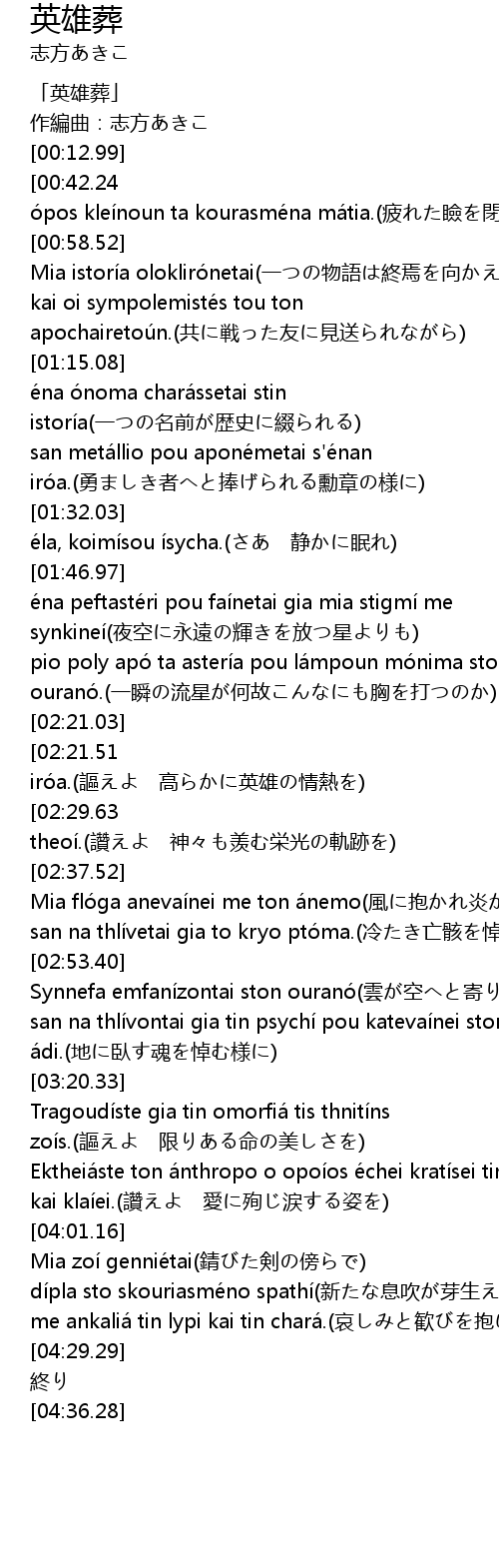 | [00:59.16] | Mia istoría oloklirónetai(一つの物語は終焉を向かえる) |