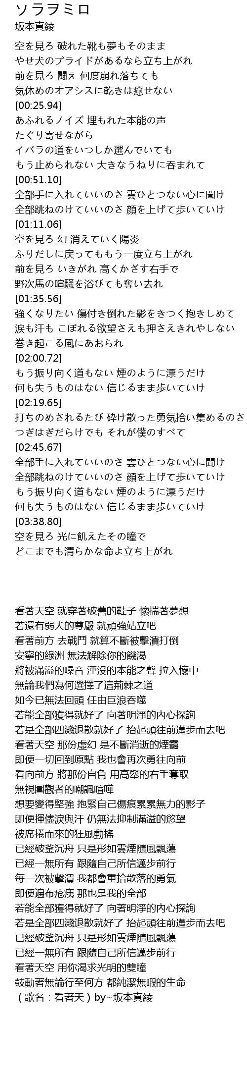 | [00:02.84] | 空を見ろ 破れた靴も夢もそのまま |